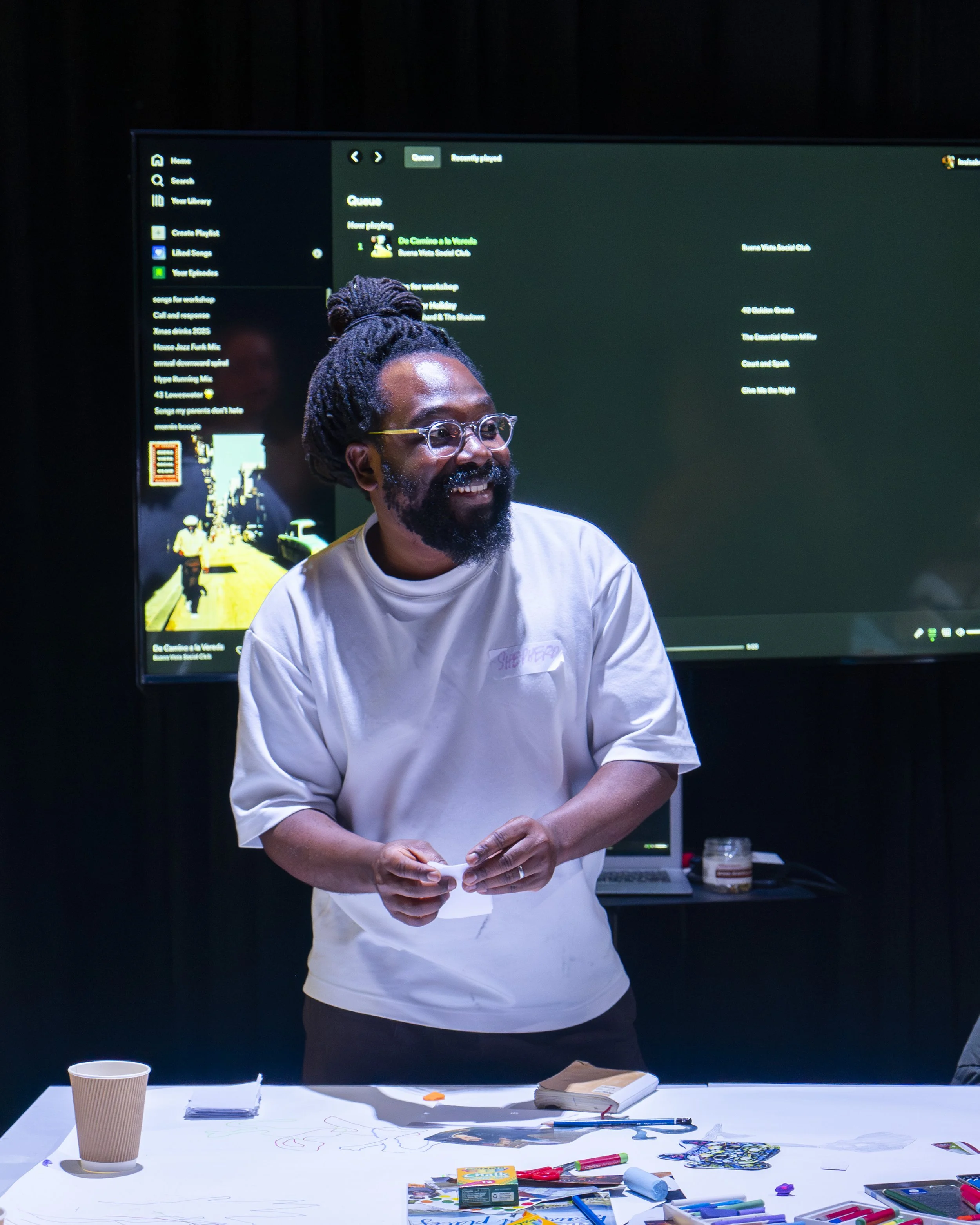 Shepherd Manyika is a London-based artist educator whose works take on multiple forms. Manyika is interested in memory, place, space, play and collaboration, concepts which he usually interrogates through the setup of the workshop as a location for art practice. He is interested in the learning, unlearning that occurs in these spaces.