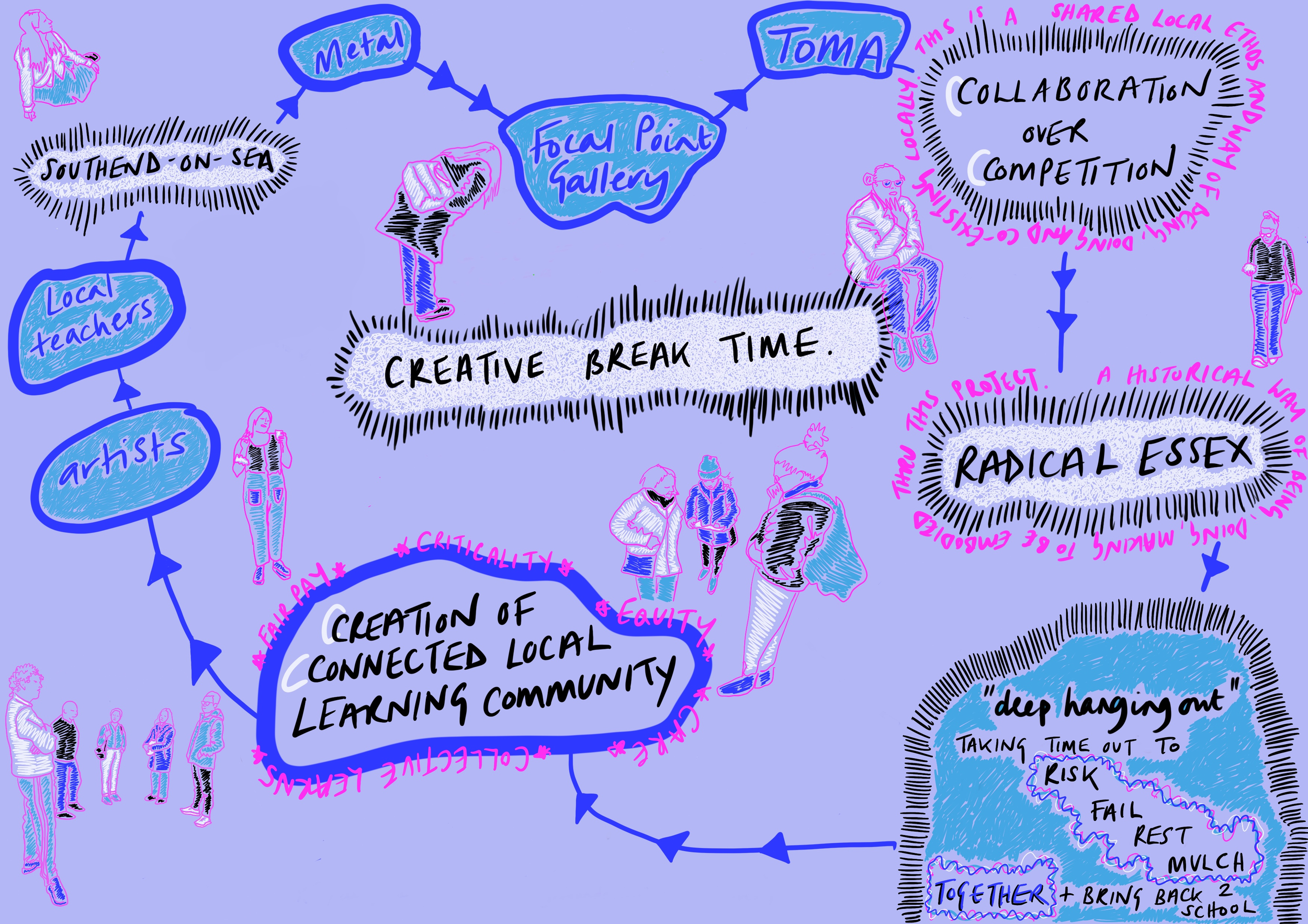 Together, Focal Point Galley, Metal Southend and The Other MA (TOMA) are launching Creative Break Time. This 3-year programme gives teachers time away from rigid planning structures to collaborate with artists and other creatives in Southend, nurturing creativity, connection and inspiration.
